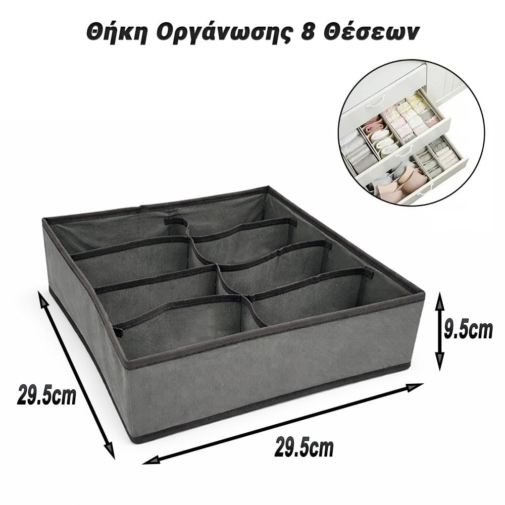 Η Θήκη Οργάνωσης 8 Θέσεων είναι ιδανική για την τακτοποίηση ρούχων, αξεσουάρ και προσωπικών αντικειμένων, προσφέροντας πρακτική και έξυπνη λύση αποθήκευσης. Με διαστάσεις 29.5×29.5×9.5cm, εφαρμόζει εύκολα σε συρτάρια, ντουλάπες και ράφια.