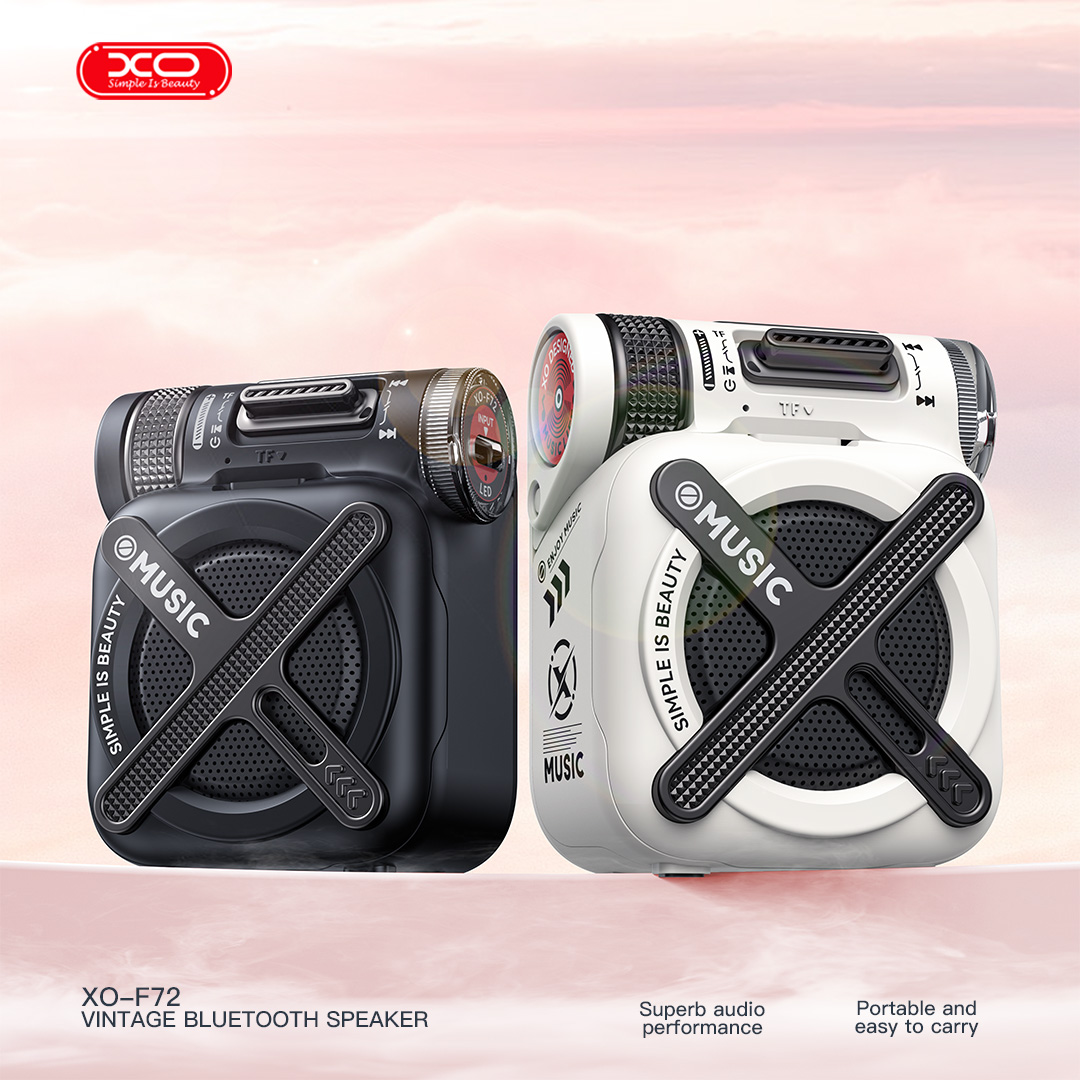 XO F72 Mecha φορητό ασύρματο ηχείο σε μαύρο χρώμα με υποστήριξη Bluetooth 5.4 και κάρτας TF. Προσφέρει ισχύ 5W, αυτονομία έως 12 ώρες, φόρτιση μέσω Type-C και μπαταρία 1000mAh για καθημερινή χρήση.