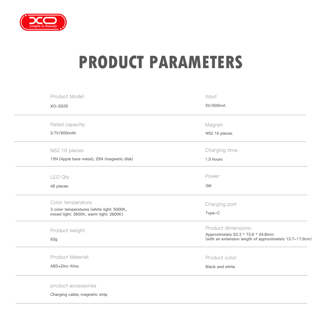 Προσδιορισμός: XO SS35 Πολυλειτουργικό Μαγνητικό Πτυσσόμενο Φως Κινητού
